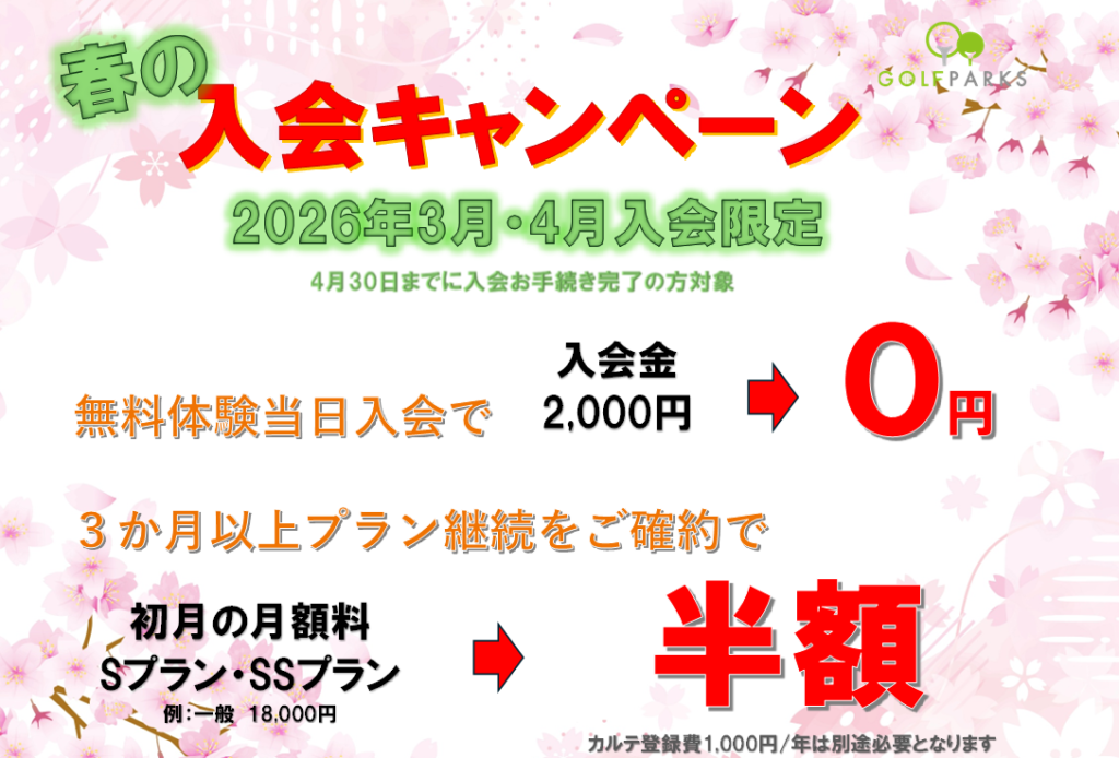 2026年3月・2026年4月入会限定 無料体験当日入会で 入会金0円 3か月以上プラン継続をご確約で 初月の月額料「Sプラン」「SSプラン」半額 ゴルフパークス上小田井店・北名古屋店の両店舗でキャンペーン中です♬ 過去